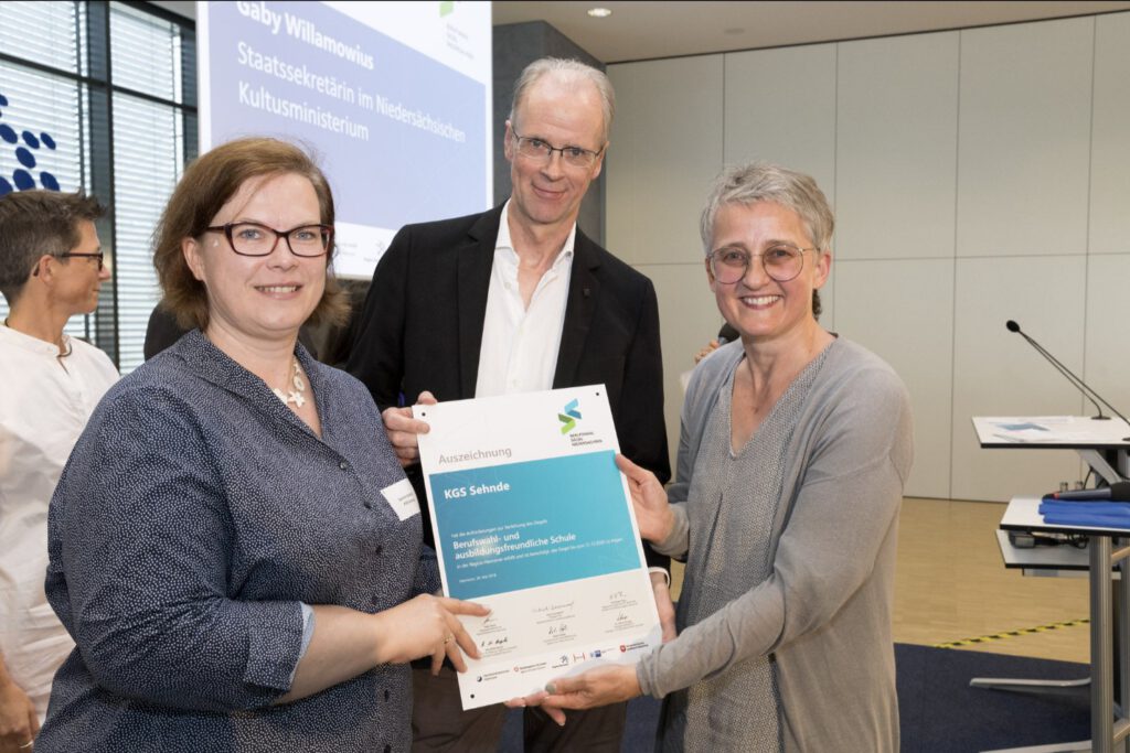Diese Bemühungen sind am 28.5.2018 bereits zum vierten Mal in Folge mit dem Gütesiegel „Berufswahl- und ausbildungsfreundliche Schule“ ausgezeichnet worden. Gaby Willamowius, Staatssekretärin im Niedersächsischen Kultusministerium, überreichte in einer Feierstunde im Haus der Region in Hannover im Namen des Schirmherrn und Ministerpräsidenten Stephan Weil die Urkunden. Insgesamt wurden 33 Schulen aus der gesamten Region Hannover mit dem Siegel versehen, darunter fünf Kooperative Gesamtschulen. Für die KGS Sehnde waren die kommissarische Schulleiterin Sandra Heidrich und der zuständige Fachbereichsleiter Helmut Glameyer dabei.