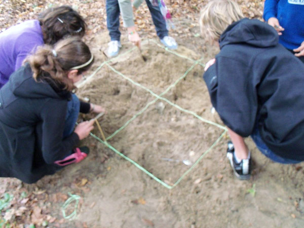 Jede Gruppe hatte ein Feld (25cm x 25cm.) und hat mit Löffel und Spachtel die Erde vorsichtig abgekratzt. Nach den ersten 2Minuten hatte die erste Gruppe ein Fundstück gefunden.